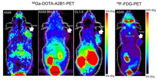 Noninvasive PET imaging of 68Ga-DOTA-A2B1, with/without a blocking dose of c(DGEAyK) peptide and 18F-FDG, in integrin α2β1-positive A549 and CL1-5 xenograft mouse models. The quantified PET imaging data indicates the binding specificity and favorable biodistribution pattern of integrin tracers. The tumors are indicated with arrows. Reproduced from [103].