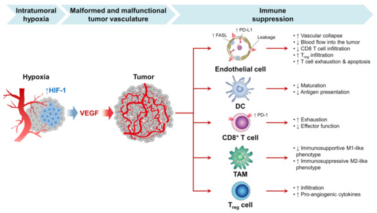 The growth of the tumor is dependent on sufficient blood vessel oxygen and nutrients. However, tumor development also exceeds current vascular supplies in rapidly progressing tumors and contributes to intratumor hypoxia. Hypoxia activates the angiogenic master switch, called the hypoxia-inducible factor-1 (HIF-1), and upregulates vascular endothelial growth factor (VEGF) in tumors. In turn, VEGF promotes tumor angiogenesis by inducing the proliferation and survival of endothelial cells (ECs), forming a myriad of malformed and malfunctional neovessels within the tumor. These tumor vessels interact with the selection of successful anticancer immunity in many phases and prohibit immune checkpoint inhibitors (ICI) therapy from being successful against the tumor [112]. Note: up and down arrows mean increase and decrease, respectively.