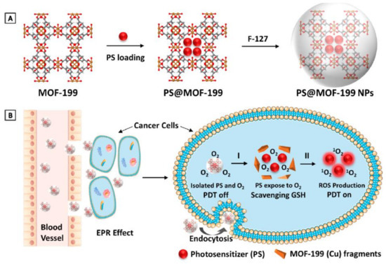 MOF-199, a Cu(II) carboxylate-based metal–organic framework (MOF), as an inert carrier to load PSs with prohibited photosensitization during delivery. (A) Synthetic scheme to PS@MOF-199 and F127-coated PS@MOF-199 (PS@MOF-199 NPs). (B) Quench and trigger of photosensitization originated from PS@MOF-199 NPs in the tumor microenvironment. Adapted with permission from [113].
