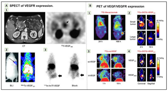 (A) Single-photon emission computed tomography (SPECT) of vascular endothelial growth factor receptor (VEGFR) expression. (1) Transverse CT image of pancreatic adenocarcinoma patient (left) and transverse SPECT image of the same patient at 1.5 h after injection of 123I-VEGF165 (right). (2) Bioluminescence imaging (BLI; after injection of d-luciferin) and SPECT images (after injection of 99mTc-VEGF121) of a tumor-bearing mouse. Tumor cells were transfected with firefly luciferase. (3) Posterior whole-body images of tumor-bearing mouse at 48 h after injection of 111In-hnTf-VEGF and after coinjection of 100-fold excess of unlabeled apotransferrin (block). Arrows in all images indicate tumors. (B) Positron emission tomography (PET) of VEGF/VEGFR expression. (1) Coronal small-animal PET images of a tumor-bearing mouse at 24 and 168 h after injection of 89Zr-bevacizumab. (2) Coronal small-animal PET images of U87MG tumor-bearing mice at 2 and 16 h after injection of 64Cu-DOTA-VEGF121. The small tumor expressed a high level of VEGFR-2, and the large tumor expressed a low level of VEGFR-2. (3) Coronal small-animal PET images of 4T1 tumor–bearing mice at 1 and 19 h after injection of either 64Cu-scVEGF (single-chain VEGF that binds to VEGFR) or the equivalent amount of 64Cu-inVEGF (inactive VEGF that does not bind to VEGFR). (4) Coronal and sagittal slices containing kidneys (arrowheads) at 4 h after injection of 64Cu-DOTA-VEGF121 (binds to both VEGFR-1 and VEGFR-2) or 64Cu-DOTA-VEGFDEE (VEGFR-2-specific). Arrows in 1–3 indicate tumors. Reproduced from [97].