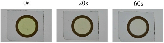 Gelatin methacryloyl–riboflavin (GelMA-RF) before and after photopolymerization. The three images show a 20% GelMA-RF hydrogel before and after photopolymerization under visible-wavelength (VW) light. Before photopolymerization, the GelMA–RF hydrogel was translucent and dark yellow. After 20 s of photopolymerization, the GelMA–RF hydrogel was translucent and pale yellow. After 60 s of photopolymerization, the GelMA–RF hydrogel was almost completely transparent. Furthermore, 10% and 15% (w/v) GelMA–RF gels were too weak to be handled for testing after 20 s and 60 s of photopolymerization (data not shown).