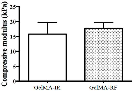 Mechanical properties of a GelMA–RF hydrogel and a GelMA–Irgacure2959 (IR) hydrogel. The compressive moduli of a GelMA-RF hydrogel and a GelMA-IR hydrogel were measured and appeared to not be significantly different. The stiffness of the two hydrogels was within the range suitable for osteoblast differentiation. Error bars represent the SD of measurements performed on five samples.