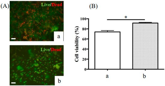 Representative fluorescence images of KUSA-A1 cells stained green (live) and red (dead). (A) The viability of cells encapsulated in 20% GelMA hydrogels after exposure to (a) UV light or (b) VW light and cultured in vitro for 1 day was measured. (B) Cell viability decreased when KUSA-A1 cells were exposed to (a) UV light as opposed to (b) VW light; * p < 0.05. UV: ultraviolet. Scale bars: 100 μm.