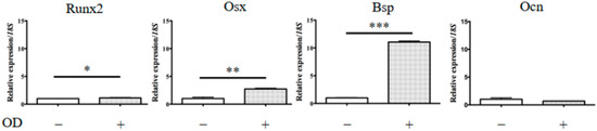 mRNA expression of osteogenesis-related genes in KUSA-A1 cells on a plastic plate. After 7 days of culture, the mRNA expression of the BSP gene in a 2D+ environment was markedly increased compared with that in a 2D environment. The data represent the mean ± SD of four independent experiments. Each experiment was performed in triplicate; * p < 0.05, ** p < 0.01, and *** p < 0.001. 2D: KUSA-A1 cells were cultured without osteogenic differentiation medium on a plastic plate; 2D+: KUSA-A1 cells were cultured with osteogenic differentiation medium on a plastic plate; Runx2: Runt-related transcription factor 2, Osx: osterix, Bsp: bone sialoprotein, Ocn: osteocalcin.