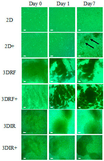 Cell morphology observations. 2D: KUSA-A1 cells were cultured without osteogenic differentiation medium on a plastic plate. 2D+: KUSA-A1 cells were cultured with osteogenic differentiation medium on a plastic plate. Discrete mineralized nodules are indicated by arrows. 3DRF: KUSA-A1 cells were encapsulated in GelMA–RF hydrogel without osteogenic differentiation medium. 3DRF+: KUSA-A1 cells were encapsulated in GelMA–RF hydrogel with osteogenic differentiation medium. 3DIR: KUSA-A1 cells were encapsulated in GelMA–IR hydrogel without osteogenic differentiation medium. 3DIR+: KUSA-A1 cells were encapsulated in GelMA–IR hydrogel with osteogenic differentiation medium. KUSA-A1 cells aggregated and exhibited spheroid-like formations in the GelMA-RF and GelMA–IR hydrogel cultures. Scale bars: 100 μm.