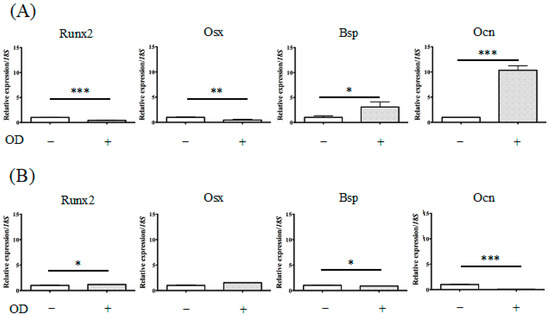 Figure 4 and Figure 6 show the mRNA transcript levels of osteogenesis-related genes in KUSA-A1 cells cultured in 2D (plastic plate), 3DRF (GelMA–RF hydrogel), or 3DIR (GelMA–IR hydrogel) with or without osteogenic differentiation medium for 7 days. The mRNA expression level of osteocalcin (Ocn), which is expressed in a late stage of osteoblast differentiation, was markedly upregulated in 3DRF, while Runt-related transcription factor (Runx2) and osterix (Osx), expressed in an early stage of osteoblast differentiation, were downregulated in 3DRF (Figure 6A). Runx2 mRNA was significantly increased in KUSA-A1 cells encapsulated in GelMA–IR hydrogel with osteo-differentiation medium (Figure 6B). These results indicated the upregulation of osteogenesis-related genes for late-stage osteoblast differentiation in KUSA-A1 cells encapsulated in the GelMA–RF hydrogel and therefore that the 3DRF environment of the GelMA hydrogel may accelerate osteoblast differentiation.