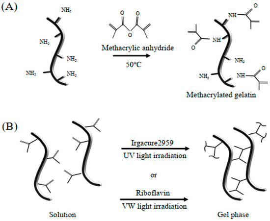 GelMA was fully dissolved in Dulbecco’s modified Eagles medium (DMEM) (Sigma-Aldrich, Madison, WI, USA), then 4 mM IR (Irgacure2959; Sigma-Aldrich, Madison, WI, USA) [30] or 4 mM RF (riboflavin; Sigma-Aldrich, Madison, WI, USA) and 4 M triethanolamine (Sigma-Aldrich, Madison, WI, USA) as a coinitiator [31] was added to create a 20% (w/v) GelMA solution at 37 °C (Figure 7B).