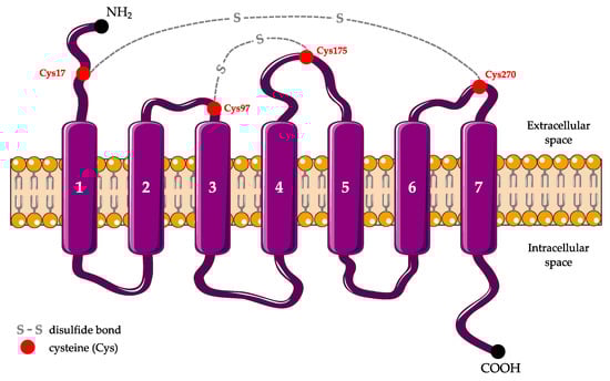 P2RY12 is a Gi-coupled receptor containing 342 amino acids and with a molecular weight of 39 kilodaltons. Its structure is composed of seven hydrophobic transmembrane regions of α-helice connected by three extra- and intracellular loops, and a carboxy-terminal helix VIII that is parallel to the membrane bilayer on the cytoplasmic side (Figure 1) []. All P2Y receptors possess four cysteine residues (Cys 17, 97, 175, 270) at their extracellular domain. Regarding P2RY12, these four cysteine residues form two disulfide bonds: the first one between the N-terminal domain and the third extracellular loop, and the second one between the first and the second extracellular loop. These disulfide bonds play a key role in the stimulation/inhibition of this receptor.