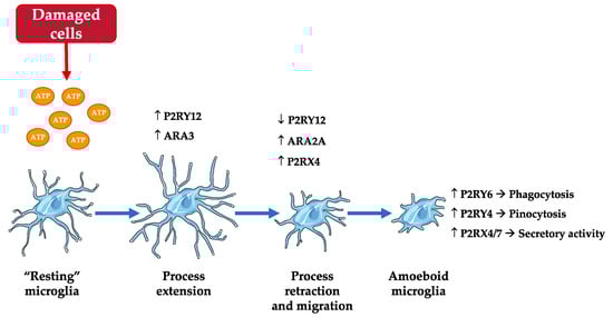 In healthy brain, “resting” microglia exhibit a ramified shape, but in pathological brain, they progressively adopt an amoeboid shape once activated. It is noteworthy that the purinergic receptor density is modified depending on microglial activation state [] (Figure 2). Indeed, in response to the chemoattractant or “find-me” signal, ATP, released from damaged cells [,], the first step of microglial activation is the stimulation of P2RY12. The latter triggers the extension of microglial processes towards the site of injury, in cooperation with another microglial receptor, the adenosine receptor (AR) A3. Then, these processes retract due to P2RY12 downregulation and ARA2A upregulation. Microglial migratory activity towards the source of released ATP also depends on the interaction between P2RY12 and P2RX4. After total retraction of microglial processes, microglia adopt an amoeboid morphology and exert phagocytosis (P2RY6), pinocytosis (P2RY4) or secretory activity (P2RX4 and 7) depending on the purinergic receptor involved.