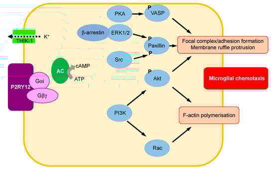 To go into further detail, several signaling pathways have been reported to be involved in microglial chemotaxis (Figure 3) [,].