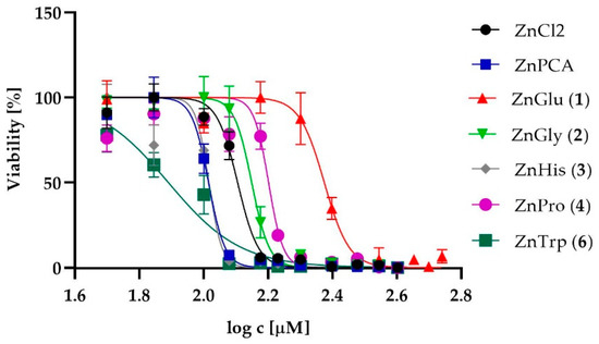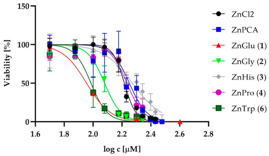 To assess the safety of their external use as active ingredients in dermatological preparations, the cytotoxicity of the zinc complexes, i.e., ZnGlu (1), ZnGly (2), ZnHis (3), ZnPro (4) and ZnTrp (6), was tested in vitro against human skin fibroblasts (1BR.3.N cell lines) and human epidermal keratinocytes, neonatal cells. ZnPCA (zinc 2-pirrolidone 5-carboxylate) and ZnCl2 were used as reference compounds. ZnMet (5) was not evaluated due to insufficient solubility. The normalized dose-response curves for analyzed zinc complexes and reference compounds for fibroblasts and keratinocytes are shown in Figure 1 and Figure 2, respectively.