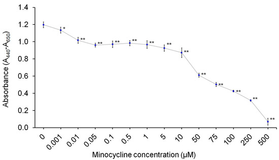 In the first stage of the study, the impact of minocycline on melanocyte proliferation was assessed in a wide range of concentrations of the tested drug: from 0.001 µM to 500 µM. Based on the obtained results, it was found that minocycline inhibited the proliferation of the tested cells proportionally to the concentration. The EC50 value after 24-h incubation was calculated to be approx. 48 µM. It should be noted that the estimated value is significantly lower for the same cell line than previously found for other melanin-binding antibiotics: aminoglycosides (streptomycin—5 mM; kanamycin—6 mM; amikacin—7.5 mM) [52,53,54] and fluoroquinolones (ciprofloxacin, moxifloxacin, and norfloxacin—500 µM; lomefloxacin—750 µM) [55,56,57].