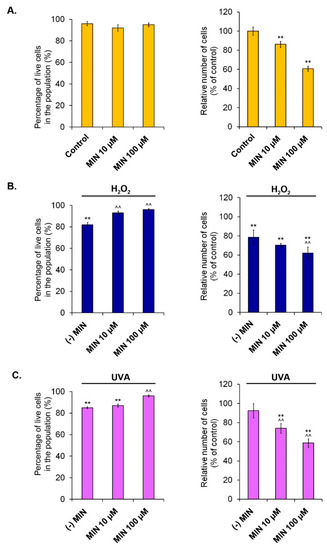The influence of minocycline on cell number and the viability of: normal human melanocytes (A), the melanocytes treated with hydrogen peroxide (B), and the melanocytes exposed to UVA radiation (C). ** p < 0.005. vs. control; ^^ p < 0.005. vs. (-) MIN.