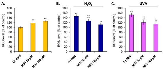 The influence of minocycline on intracellular reactive oxygen species (ROS) level in human normal melanocytes (A) as well as melanocytes additionally exposed to hydrogen peroxide (B) or irradiated with UVA (C). * p < 0.05, ** p < 0.005 vs. control; ^^ p < 0.005. vs. (-) MIN.