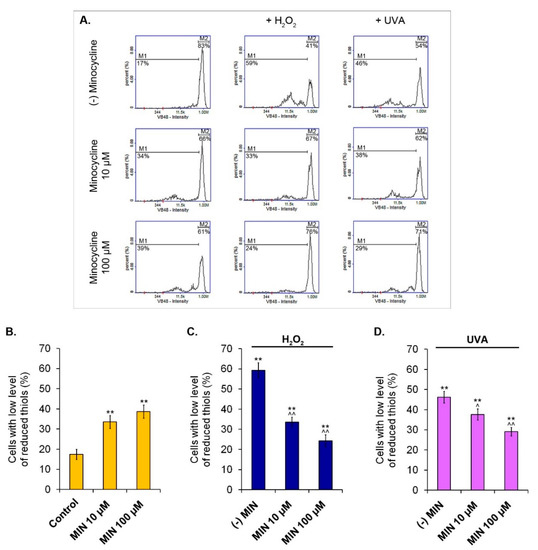 The measurement of the intracellular level of reduced thiols was made cytometrically. The obtained results are presented in Figure 5. The percentage of melanocytes with a low level of reduced thiols was increased after the treatment with minocycline, proportionally to the drug concentration. The low level of reduced thiol was stated in 17.4% (±2.6%) of cells in the control, as well as in 33.6% (±3.2%) and 38.7% (±3.3%) of melanocytes incubated with 10 µM and 100 µM of minocycline, respectively. Analogical results for cells exposed only to hydrogen peroxide or UVA radiation were 59.3% (±3.8%) and 46.2% (±2.9%), respectively. The pretreatment with minocycline significantly elevated the number of melanocytes with a high level of reduced thiols. The percentage of hydrogen peroxide-exposed cells with a low level of reduced thiols was 33.6% (±2.4%) and 24.3% (±3.0%) for 10 µM and 100 µM of minocycline, respectively. In turn, the percentage in cell cultures irradiated with UVA was reduced to 37.6% (±2.8%) and 29.1% (±2.1%) for 10 µM and 100 µM of the drug, respectively.