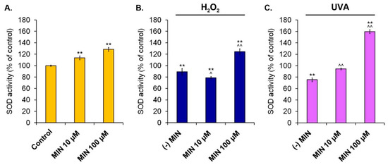 Changes of superoxide dismutase activity in human normal melanocytes treated with minocycline (A) as well as additionally exposed to hydrogen peroxide (B) or irradiated with UVA (C). ** p < 0.005. vs. control; ^ p < 0.05, ^^ p < 0.005. vs. (-) MIN.