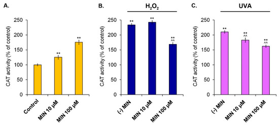 Changes of catalase activity in human normal melanocytes treated with minocycline (A) as well as additionally exposed to hydrogen peroxide (B) or irradiated with UVA (C). ** p < 0.005. vs. control; ^^ p < 0.005. vs. (-) MIN.