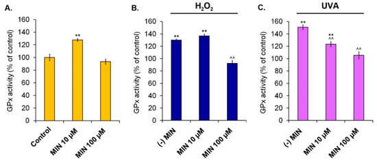 Changes of glutathione peroxidase activity in human normal melanocytes treated with minocycline (A) as well as additionally exposed to hydrogen peroxide (B) or irradiated with UVA (C). ** p < 0.005. vs. control; ^^ p < 0.005. vs. (-) MIN.