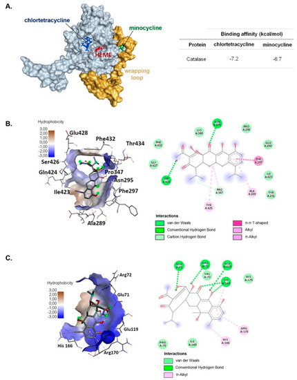 Molecular docking analysis of minocycline and chlortetracycline complexes with human catalase (A). The characteristic of interactions between minocycline (B) and chlortetracycline (C) and the responding binging sites within the enzyme.
