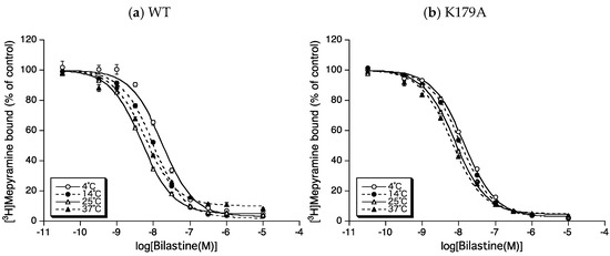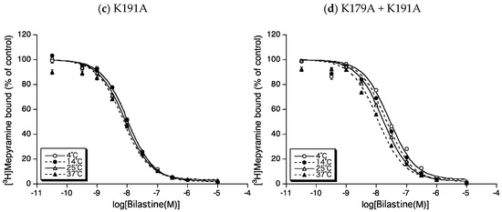 CHO cells stably expressing WT, K179A, K191A, and K179A + K191A were cultured, and membrane preparations were obtained as described previously [25,26,27]. The receptor binding assay with [3H] mepyramine, a radioligand for H1 receptors, was performed in accordance with the methods described previously [25,26,27]. Briefly, aliquots (0.1 mL) of membrane preparations (approximately 50 µg of membrane proteins) were incubated with 3 nM [3H] mepyramine in the presence or absence of various concentrations of bilastine for 3 h at 37 °C, 24 h at 25 °C and 14 °C, and 7 days at 4 °C in normal HEPES buffer (NaCl, 120 mM; KCl, 5.4 mM; MgCl2, 1.6 mM; CaCl2, 1.8 mM, D-glucose, 11 mM; and HEPES, 25 mM; pH 7.4 at 37 °C; final volume 1 mL). The reaction mixture was filtered through glass fiber filters, and the radioactivity trapped on the filters was determined by scintillation counting. All determinations were made in quadruplicate. The protein content in the membrane preparations was determined using a BCA protein assay kit (Pierce, Rockford, IL, USA).
