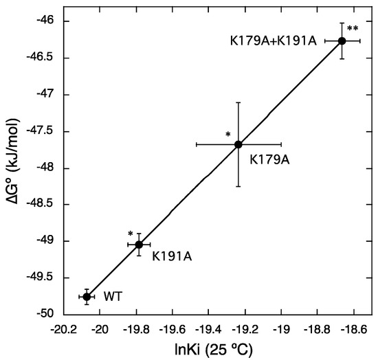 Changes in the values of ∆G° and lnKi of bilastine by mutations in Lys179ECL2 and/or Lys1915.39. Scatter plots of values of ∆G° versus lnKi of bilastine for WT, K179A, K191A, and K179A + K191A are shown, in which ∆G° values were calculated according to the equation, ∆G° = RTlnKi, at a standard temperature of 25 °C (298.15 K). Increases in values of ∆G° and lnKi represent reductions in the affinities for bilastine by mutations of Lys179ECL2 and/or Lys1915.39. * p < 0.05, ** p < 0.01; compared to the values for WT.