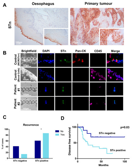 The STn antigen is overexpressed in esophageal squamous cell carcinomas (ESCC) and CTCs, being associated with recurrence and decreased disease-free survival. (A) The STn antigen is overexpressed in approximately 70% of ESCC and adjacent lymph node metastasis and shows little expression in the healthy esophagus. Most ESCC and lymph node metastasis present focal STn expressions showing high intensity staining at the cell membrane. On the other hand, the healthy esophagus shows a diffuse low to moderate cytoplasmatic staining in differentiating cells of the mucosa facing the lumen of the organ. (B) CTCs recovered from the blood of ESCC patients express the STn antigen. CTCs were isolated from whole blood by size-based microfluidics devices presenting an internal architecture that enables the entrapment of larger cancer cells with minimal contamination from blood cells. In addition to STn (green), cell nuclei were stained with 4′,6-diamidino-2-phenylindole, dihydrochloride (DAPI) (blue), pan-CKs (red) was used as an epithelial marker, generally expressed by some subpopulations of cancer cells and CD45 (purple) was used to identify blood cells. ESCC-derived CTCs presented a DAPI+/pan-CKs-/STn+/CD45− phenotype. MCRSTn+ bladder cancer cells were used as positive control for cancer cells expressing the STn antigen (DAPI+/pan-CKs+/STn+/CD45−) and blood cells from healthy donors were used to demonstrate the absence of STn in CD45+ cells (DAPI+/pan-CKs−/STn−/CD45−). (C) STn expression associates with recurrence (* p < 0.05; Chi-square) and (D) disease-free survival (p = 0.03, Chi-square).