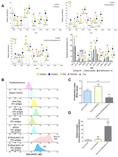 The stable transfection of ST6GALNAC1 leads to STn expression in Kyse-30 cells without inducing profound glycome remodeling and induces a massive decrease in proliferation and a significant increase in invasion. (A) Kyse-30 cells express elongated O-glycans and do not express STn, whereas Kyse-30 ST6GalNAc1 KI express STn with minor alterations in the glycome. Glycomics analysis on Kyse-30 revealed a glycome dominated by several core 2 O-glycans (m/z 817.43; 1021.53; 1195.62; 1382.71; 1470.76) as well as T (m/z 572.31) and sialylated T antigens (m/z 933.48). Core 3 was also detected. (m/z 613.33). Mock cells presented a similar profile, even though showing the T antigen (m/z 572.3) as major ion and presenting low amounts of di-sialyl-T (m/z 1294.7). Neither wild type nor mock cells expressed the STn antigen (m/z 729.4). On the other hand, ST6GALNAC1 transfected cells presented a glycome very similar to wild type cells but were the only cells expressing STn (m/z 729.4). (B) Flow cytometry analysis confirms the low STn levels in Kyse-30 and the massive increase in this antigen after stable transfection with ST6GalNAc1. The stable transfection with ST6GALNAC1 leads to a significant increase in STn in almost 90% of the cells. The signal significantly decreases with the removal of the sialic acid after sialidase (NeuAse) digestion, confirming the presence of STn. Notably, the extension of NeuAse digestions is never complete, explaining the presence of lower amounts of STn in the cells after treatment. (C) The overexpression of STn resulting from ST6GalNAc I overexpression leads to a massive decrease in proliferation. (D) The overexpression of STn resulting from ST6GalNAc I overexpression leads to a massive increase in invasion. ns: not significative; * p < 0.05; ** p < 0.01; *** p < 0.001; Mann-Whitney for three independent replicates in proliferation assays and five independent replicates in invasion assays.