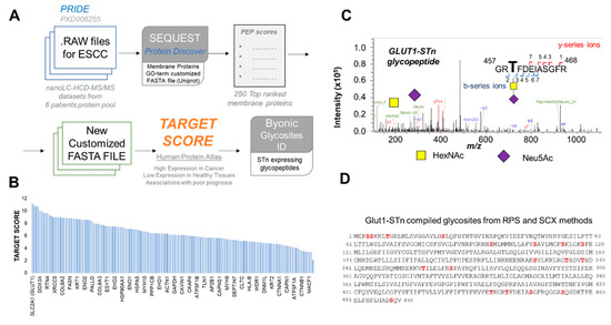 The following are available online at https://www.mdpi.com/1422-0067/22/4/1664/s1, Figure S1: GLUT1-STn glycopeptides (green) and glycosites (red) identified in ESCC using the RPS method, Figure S2: GLUT1-STn glycopeptides (green) and glycosites (red) identified in ESCC using the SCX method, Table S1: RPS proteins, Table S2: SCX proteins, Table S3: Common proteins, Table S4: Target Score.