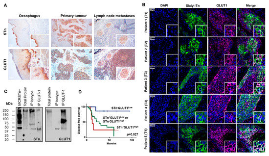 GLUT1-STn is widely expressed in ESCC and correspondent metastases and associates with decreased disease-free survival. (A) GLUT1 and STn are co-localized in the same tumor areas in primary tumors, lymph node metastases but not in the healthy esophagus. The immunohistochemistry analysis panels show the co-expression of GLUT1 and STn in the same areas in tumors and lymph node metastases strongly suggesting GLUT1-STn glycoforms. Immunohistochemistry of the healthy esophagus suggests that these epitopes are present in different areas. (B) GLUT1 and STn are expressed in the same cancer cells in all studied tumors. Double immunofluorescence for GLUT1 and STn show co-localization in the same cells in all studied tumors, across different stages and histopathological natures of the disease. Nuclei stained in blue; STn in green; GLUT1 in purple; Co-expression (white). (C) Western blot confirms the existence of GLUT1-STn glycoproteoforms. GLUT1 was immunoprecipitated from ESCC and blotted for both GLUT1 and STn. Isotype immunoprecipitated proteins were used as negative controls. MCRSTn+ bladder cancer cell line was used as positive control for STn expression. All blots showed bands at 250 kDa and above most likely resulting from unspecific co-precipitation of mucins carrying STn. On the other hand, GLUT1 blots evidence a major band just above 75 kDa not present in STn blots. A less intense band at approximately 50 kDa was observed in both GLUT1 and STn blots reinforcing the existence of GLUT1-STn. (D) GLUT1-STn overexpressing tumors present reduced decreased survival when compared to tumors showing no STn expression or high STn expression and decreased levels of GLUT1.