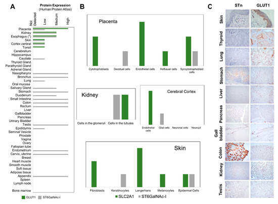 STn and GLUT1 expressions are rarely overlapping in healthy tissues. (A) GLUT1 and ST6GalNAc I (a key glycosyltransferase for STn biosynthesis) expressions in healthy human tissues. According to the Human Protein Atlas, GLUT1 and ST6GalNAc I are co-expressed in the placenta, kidney, skin and the cerebral cortex, suggesting potential to express GLUT1-STn. GLUT1 for the esophagus concerned experimental data from the present report, according to Figure 4A. (B) GLUT1 and ST6GalNAc I expressions in different cell types of the placenta, kidney, cerebral cortex and skin. Syncytiotraphoblast cells of the placenta, cells in the kidney tubules and epidermal cells of the skin co-express GLUT1 and ST6GalNAc I, supporting capacity to present GLUT1-STn. (C) GLUT1 and STn expressions in the skin, thyroid, lung, stomach, liver, pancreas, gallbladder, colon, kidney, testis. GLUT1 was detected at the cell membrane in the immune cells’ component of the stomach, liver, colon, lung and pancreas. STn was found mostly in the cytoplasm and, to less extent, the membrane of parietal and goblet cells of the respiratory and digestive tracts. No evidence supporting co-expression in the same areas were found.