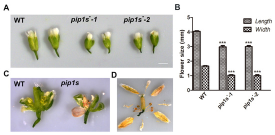 Compared to the WT plants, significantly reduced lengths and widths of mature flowers were observed in pip1s−-1 and pip1s−-2 mutants (Figure 3A,B). Many flower buds of pip1s− mutants began to wither before flowering (Figure 3C). Eventually, the sepals, petals, stamens, and all carpels of the flower withered (Figure 3D).
