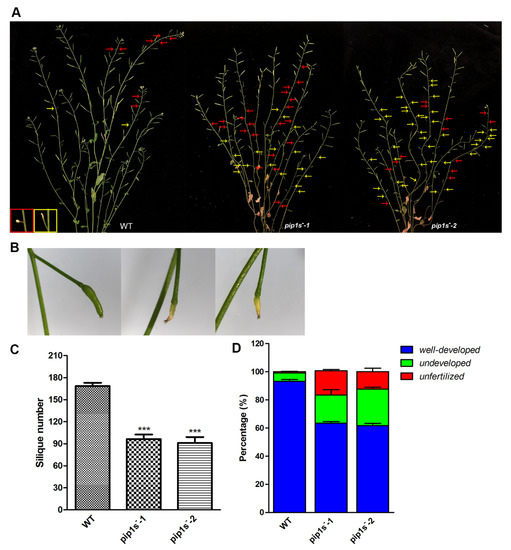 Unfertilized or withered flowers and undeveloped siliques were observed in both WT and pip1s− mutant plants (Figure 4A). Undeveloped siliques turned yellow, wilted, and even moldy during silique development (Figure 4B). The number of siliques per plant was significantly reduced in the pip1s− mutants compared to the WT plants (p < 0.01) (Figure 4C). We divided these siliques into three major categories: well-developed, undeveloped, and unfertilized (Figure 4D). The percentages of undeveloped and unfertilized siliques were substantially increased in the pip1s− mutants.