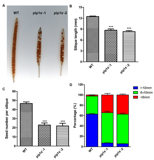 When comparing the developed siliques of the WT and pip1s− mutant plants, we found that the mutant siliques were nicked (Figure 5A). The pip1s− mutants had shorter silique lengths than the WT plants at 14 days after flowering (DAF) (Figure 5B). The average seed number per silique of the WT was 46.7, which was significantly greater than that of the pip1s−-1 (23.8) and pip1s−-2 (23.1) (p < 0.01) (Figure 5C). We divided the silique length into three categories: >10 mm, 6–10 mm, and <6 mm. The silique lengths of the pip1s−-1 and pip1s−-2 mutants were largely reduced compared to the WT plants (Figure 5D).