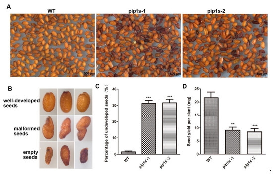 Phenotypic analysis of seeds from the WT, pip1s−-1 and pip1s−-2 plants. (A) The seeds of WT, pip1s−-1 and pip1s−-2 plants. (B) The phenotype of well-developed seeds, malformed seeds and aborted seeds. (C) Statistical analysis of the percentage of undeveloped seeds. (D) Statistical analysis of the seed yield per plant of the WT, pip1s−-1 and pip1s−-2 plants. Bars represent the means ± SD of three biological replicates. Significant differences were determined by one-way ANOVA followed by Duncan’s multiple range test (** p < 0.0005, *** p < 0.0001).