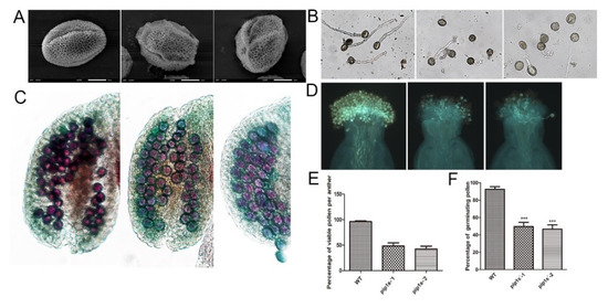 Scanning electron microscopy indicated that both the WT and pip1s− mutant pollen had regular honeycomb outer wall structures. However, the outer wall of the mutant pollen was deformed and shrunk (Figure 7A). Pollen germination experiments conducted in vitro revealed that the pollen germination rate of the pip1s− mutant was significantly lower than the WT plant (p < 0.01) (Figure 7B,F). The pollen germination experiment conducted in vivo produced similar results, and the pollen-stigma binding ability of the pip1s− mutant was impaired compared to the WT plant (Figure 7D). Alexander staining experiments displayed a lower number of active pollen grains per anther in the pip1s− mutant than in the WT plant (Figure 7C).