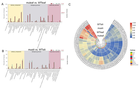 GO enrichment analysis and KEGG pathway analysis. (A,B) Gene Ontology (GO) analysis of cellular components, biological processes and molecular functions of muleaf vs. WT (A) and musili vs. WT (B). (C) KEGG pathway and cluster analysis of 99 DEGs. Plant hormone signal transduction (PHST); starch and sucrose metabolism (SSM); phenylpropanoid biosynthesis (PB); flavonoid biosynthesis (FB); cutin, suberin and wax biosynthesis (CSWB); DNA replication (DR); and photosynthesis (PAP).
