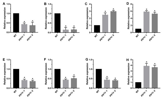 The WT, pip1s−-1, and pip1s−-2 plants were grown on soil under 16/8 h light/dark conditions to investigate the phenotypes of the pip1s−. Compared to the WT plant, the pip1s− mutants had smaller rosette leaves and fewer rosette leaves during the vegetative stage (Figure 2A–D). Early bolting was observed in the pip1s− mutants under normal growth conditions (Figure 2A). The bolting time in the pip1s− mutants was significantly advanced (up to 3 days) compared to the WT plants (Figure 2E).