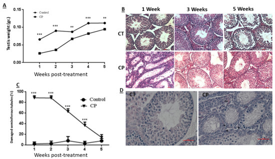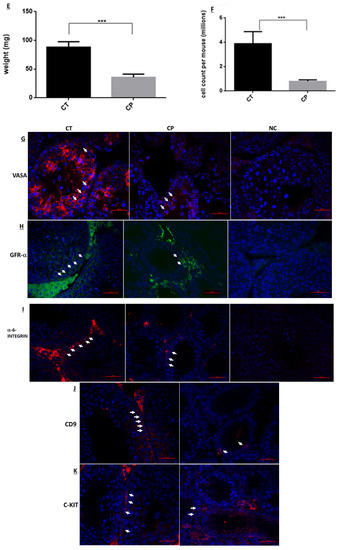 Our results show that CP treatment of immature mice (CP) significantly decreased (p < 0.001) their testicular weight during 5 weeks after the last injection compared to control (CT) (Figure 1A). CP treatment also impaired seminiferous tubules histology during 3 weeks after the last injection (Figure 1B). The germinal epithelium was decreased (the cell layer decreased and the diameter of the lumen increased in tubules of CP-treated immature mice compared to CT), and seminiferous tubules appeared empty of most of the cells 1 and 3 weeks post treatment as compared to CT (Figure 1B). The most severe damage for seminiferous tubules can be seen 1–2 weeks post-treatment with CP compared to CT (Figure 1C,D). Afterwards, testis could restore, and after five weeks post-treatment, the histology of the STs were similar to control group (Figure 1B,C). Next, we examined the effect of CP at day 10 post-treatment on seminiferous histology (Figure 1D), testes weight (Figure 1E), and testes total cell count (Figure 1F). Our results show that CP treatment (CP) of immature mice significantly decreased the testicular weight 10 days after the last CP-treatment (Figure 1E; p < 0.001) and testicular cell count (Figure 1F; p < 0.001) compared to control (CT). In addition, the number of VASA, GFR-α-1-, α-6-Integrin, CD9, and C-KIT-positive stained cells/tubule (as a premeiotic cell marker; [2,46,49]) was significantly reduced in testicular tissue of CP-treated immature mice compared to CT (Figure 1).