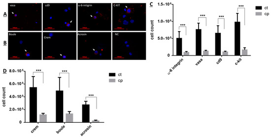 The effect of CP on the number of subpopulation of spermatogenic cells (pre-meiotic and meiotic/post-meiotic cells) isolated from seminiferous tubules of immature mice was examined 10 days after the last CP-injection by using immunofluorescence staining specific for each type of cells premeiotic cells (Figure 2A) and meiotic/post-meiotic cells (Figure 2B) [2,46,49]. Our results show that CP treatment (cp) significantly reduced the number of premeiotic cells that specifically stained to α-6 INTEGRIN, VASA, CD9, and c-KIT compared to control (ct) (Figure 2C; p < 0.001). Moreover, CP treatment significantly reduced the number of meiotic cells that specifically stained to CREM and BOULE markers and to the meiotic/post-meiotic marker (ACROSIN) compared to control (Figure 2D; p < 0.001).