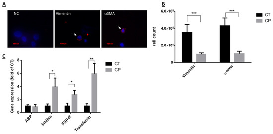 The effect of CP on the number of Sertoli and peritubular cells isolated from seminiferous tubules of immature mice was examined 10 days after last CP-injection, as examined by using specific immunofluorescence staining for each type of cells (VIMENTIN—a marker of Sertoli cells and αSMA—a marker of peritubular cells) (Figure 3A). Our results show that CP treatment (CP) significantly reduced the number of Sertoli and peritubular cells compared to control (CT) (Figure 3B; p < 0.001). On the other hand, evaluating the effect of CP on the functionality of Sertoli cells by examining the expression levels of some functional factors (known to affect spermatogenesis) produced by Sertoli cells, show that CP treatment significantly increased the expression levels of inhibin, FSH-receptor (FSH-R) and transferrin compared to control (Figure 3C; p< 0.05, 0.05, and 0.01, respectively), but did not significantly affect the expression levels of androgen binding protein (ABP) compared to control (Figure 3C).