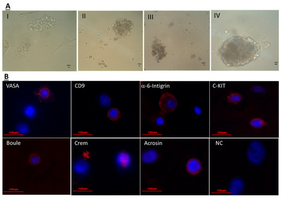 Our results show that isolated cells from seminiferous tubules of immature mice ten (10) days post CP treatment still have spermatogenic cells that were positively stained for pre-meiotic (VASA, CD9, GFR-α, α-6-INTEFRIN, and c-KIT), meiotic (BOULE and CREM), and to meiotic/post-meiotic (ACROSIN) markers [before culture (BC)] as examined by immunofluorescence staining using specific antibodies for each marker (Figure 2A,B) and summarized in Table 1. In the present study, we were able to induce the proliferation (production of colonies; Figure 4A) and differentiation [a significant increase in the number of c-KIT and ACROSIN positive cells (after culture; AC) of the spermatogonial cells in vitro in MCS, compared to control (Table 1) (Figure 4B)]. The morphology of the developed colonies in the 3D culture was different, without relation to the type of treatment (I, II—colonies with medium size and different morphology, III—colonies with small size, IV—a big colony with attached marginal cells and detached cells). The cells in the developed cultures contained cells of the premeiotic (VASA, CD9, α-6-integrin, C-KIT), meiotic (Boule, Crem), and meiotic/post-meiotic stages (Acrosin). Our results show that in vitro culture of the isolated cells in MCS maintain the percentage of the premeiotic cells VASA, CD9, and GFR-a, but significantly decreased the percentage of a-6-INTEGRIN cells compared to before culture (BC) (Table 1). On the other hand, the percentage of the meiotic cells BOULE and CREM did not change compare to BC (Table 1). However, the percentage of the meiotic/post-meiotic ACROAIN-positive cells was significantly increased in MCS (AC) compared to BC (Table 1).