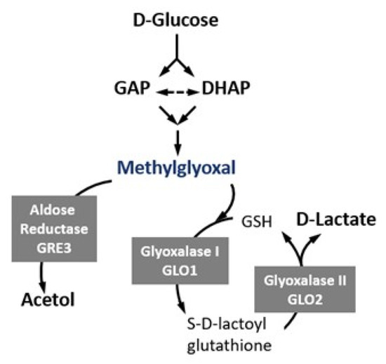 Overview of methylglyoxal (MGO) metabolism. MGO, the most reactive glycating agent is primarily formed from the spontaneous decomposition of the phosphate group of glyceraldehyde 3-phosphate (GAP) and dihydroxiacetone phosphate (DHAP). It may also arise from the oxidation of aminoacetone in the catabolism of l-threonine from the oxidation of ketone bodies and the oxidation of acetone. MGO is catabolised via the glyoxalase system (Glo1 and Glo2), resulting in the formation of D-lactate and glutathione, and by aldose reductase Gre3, resulting in acetol formation.