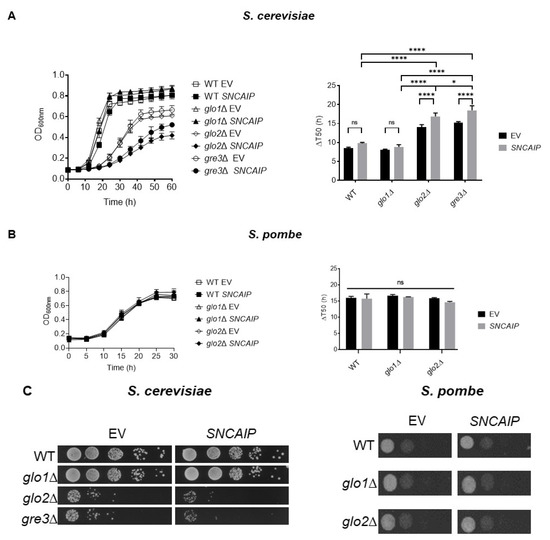 Analysis of the repercussions of a disrupted methylglyoxalase system and aldose reductase activity on the growth of SNCAIP-expressing S. cerevisiae (A and C left) and S. pombe (B and C right). ∆T50 indicates the number of hours needed for a strain to reach the OD value corresponding to half the ODmax value. Data represent the combined results of three clones per strain. Error bars represent the standard deviations based on the obtained data of these clones. Significance is determined using a one-way ANOVA test (p-value of 0.05, significance indicated by the asterisk; n = 3, * = p < 0.05, **** = p < 0.0001). Non-indicated differences between strains are not significant. Growth of S. cerevisiae and S. pombe was measured using 96-well and 24-well plates, respectively. EV = empty vector; ns = not significant.