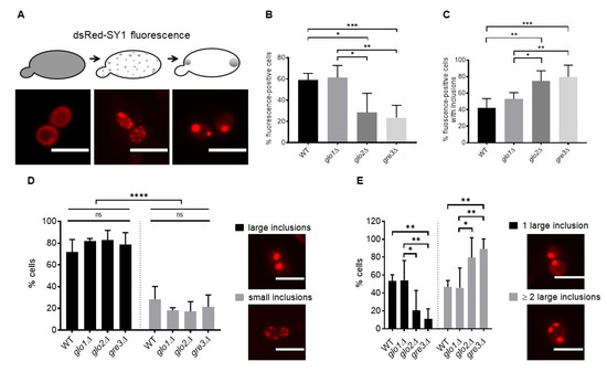Analysis of the repercussions of a disrupted methylglyoxalase system and aldose reductase activity on SY1 inclusion characteristics in S. cerevisiae. dsRed-SY1 forms consecutively small oligomers and larger membrane-localised aggregates in wt S. cerevisiae [14] (A). The percentage of wt, glo1∆, glo2∆, and gre3∆ cells displaying dsRed-SY1 fluorescence (B), dsRed-SY1 fluorescence and inclusions (C), small or large dsRed-SY1 inclusions (D), and multiple large dsRed-SY1 inclusions (E) was calculated. Data represent the combined results of at least 800 counted cells of three clones per strain. Error bars represent the standard deviations based on these counts. Significance is based on the total number of cells and determined using a one or two-way ANOVA test (p-value of 0.05, significance indicated by the asterisk; n = 3, * = p < 0.05, ** = p < 0.01, *** = p < 0.001, **** = p < 0.0001). Non-indicated differences between strains are not significant. The scale bars represent 10 µm. SY1 = Synphilin-1; ns = not significant.