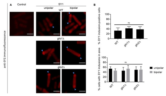 Similarly, we assessed SY1 inclusion formation in wt, glo1∆, and glo2∆ S. pombe strains. To this end, we expressed non-tagged SNCAIP and detected using an anti-SY1 antibody. SY1 inclusions were observed in cells of all three strains, with inclusion-positive cells containing either one polar-localised inclusion or two inclusions, one at each of the two poles (Figure 4A). In symmetrically dividing organisms such as S. pombe, asymmetric distribution of fused protein aggregates between daughter cells has been shown to serve as a protective mechanism that allocates damaged proteins to only one daughter cell, while preserving the cellular health of the other daughter cell [39,40,41]. Quantification did not reveal a statistically significant difference in the number of SY1 inclusion-positive cells nor in the number of cells displaying solely one unipolar or two bipolar inclusions between any of the strains (Figure 4B). However, the inclusion size in cells containing two inclusions was highly similar to the size of inclusion in cells that only contained one inclusion.