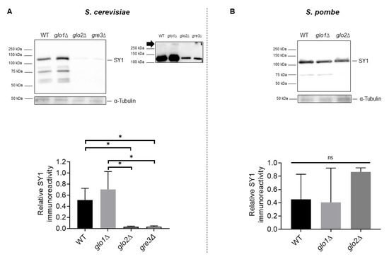 The observed difference in the percentage of fluorescence positive cells between wt and glo1∆ cells on the one hand, and glo2∆ and gre3∆ cells, on the other hand, prompted verification of the SY1 protein level via Western blot analysis. To this end, we subjected whole-cell extracts of wt, glo1∆, glo2∆, and gre3∆ S. cerevisiae, and wt, glo1∆, and glo2∆ S. pombe strains to Western blot analysis using an anti-SY1 antibody. Our analysis confirmed that glo2∆ and gre3∆ S. cerevisiae strains displayed a reduced SY1 protein content in comparison to wt and glo1∆ strains (Figure 5A), a result in line with the fluorescence microscopy data. This was surprising given the observations indicating negative cross-talk between glycation and ubiquitination of proteins, including αSyn [42,43].