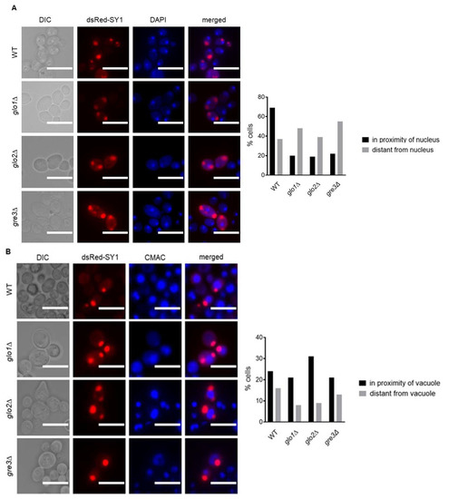 Therefore, we assessed the extent to which inclusions were perivacuolarly localised, indicative of SY1 inclusion localisation to IPOD. Preliminary quantification of the number of inclusions located either in the proximity of/or distant to the nucleus revealed that in the majority of glo1∆, glo2∆, and gre3∆ cells, dsRed-SY1 inclusions were distantly located. In contrast, inclusions in the majority of wt cells displayed perinuclear localisation (Figure 6A). Inclusions in the majority of cells of all strains were found in the proximity of the vacuole (Figure 6B). Combined, these findings indicate the involvement of both JUNQ and IPOD in degrading inclusions formed in wt cells, while SY1 inclusions in glo1∆, glo2∆, and gre3∆ cells seem to be degraded primarily via autophagy through sequestration in IPOD [45].