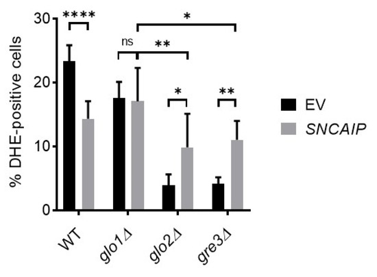 Impact of a disrupted methylglyoxalase system and aldose reductase activity on SY1-associated oxidative stress in S. cerevisiae. Calculated percentages of dihydroethidium (DHE)-positive cells indicate the extent of induced oxidative stress in each strain. Data represent the combined results of cells of five clones per strain. Error bars represent the standard deviations based on DHE-positive cell counts of these clones. Significance is based on the total number of cells counted and determined using two-way ANOVA analysis (p-value of 0.05, significance indicated by the asterisk; n = 5, * = p < 0.05, ** = p < 0.01, **** = p < 0.0001). Non-indicated differences between strains are not significant. DHE = dihydroethidium; EV = empty vector; ns = not significant.