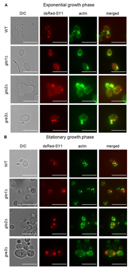 On the other hand, during the stationary phase, multiple potential actin bodies were observed in wt, glo1∆, glo2∆, and gre3∆ cells. These actin reserves were dispersed throughout the cell but primarily found near the cell membrane. In addition, cells of all, but especially of glo2∆ and gre3∆, strains contained a higher number of large inclusions during the stationary growth phase compared to cells in the exponential growth phase. In each case, at least one inclusion of each cell localised to one or more actin bodies (Figure 8B).