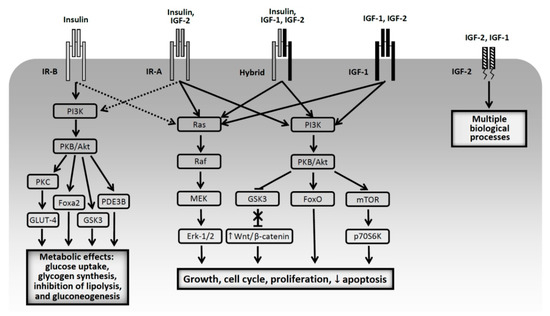 Schematic presentation of types of insulin and IGF receptors and post-receptor effects after binding to their ligands (based on [34,35,36,37,38,40]). PI3K—phosphatidylinositol 3-kinase; PKB—protein kinase B; PKC—protein kinase C; Fox—forkhead box protein; PDE3B—phosphodiesterase 3B; GLUT-4—glucose transporter-4; GSK3—glycogen synthase kinase 3; ERK—extracellular signal-regulated kinases; mTOR—mammalian target of rapamycin, p70S6—p70S6kinase. Solid lines: main pathways activated by ligand binding, dotted lines: additional pathways.
